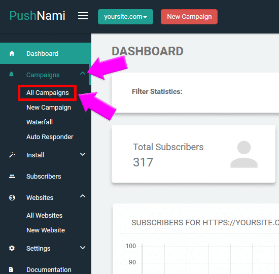 If you are sending push notifications to multiple websites, you can view a list of websites by clicking “All Websites” under “Websites” on the left side bar. This will allow you to find information on each website such as domain name, date of creation, SSL (yes or no) and number of subscribers.